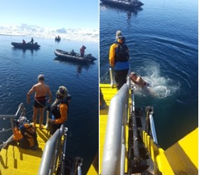 The high point of the cruise for me was the polar plunge. The plunge was the last thing I intended to do on this trip. I am not one of those people who take cold water showers round the year, and in fact I shower with warm or hot water even in summer in Pune. We had not signed up for any of the activities like skiing or mountaineering, thinking that Antarctica was not the best place to start skiing or mountaineering if you had never done it before. As it turned out, mountaineering did not really involve any heavy duty climbing, and I could have easily done it, but by the time the cruise started, the group was already full and there were no places left. When the crew announced the polar plunge, I began wondering if I should try it. I had read somewhere that a thermal shock could induce a cardiac arrest in somebody who has a cardiac history. I consulted the ship doctor if there were any contra indications, and he assured me that he had never seen any medical emergencies caused by a plunge. Surprisingly, a large number of people had lined up for the plunge, and I decided to do it too.
