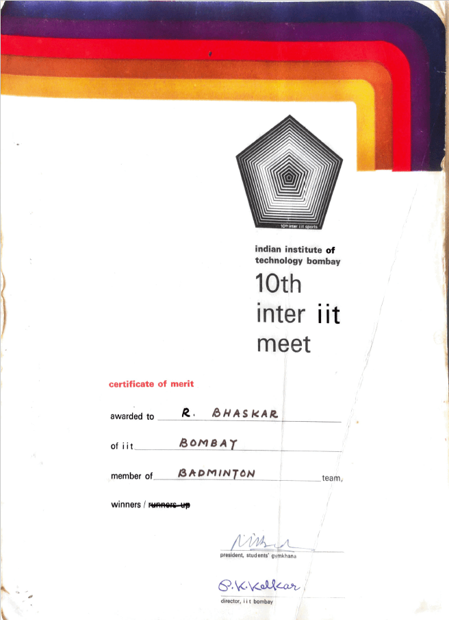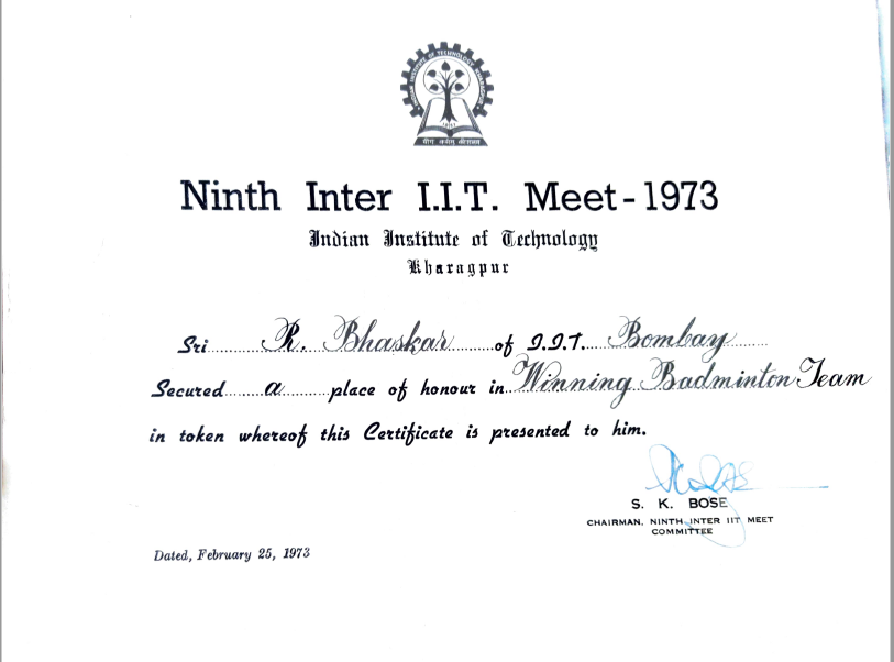 In 1971 the Inter IIT meet was cancelled due to the Indo-Pak war. Subsequently after Radheshyam graduated, Ramesh became the captain, and we travelled to Kharagpur for the inter IIT meet in 1973 where we won. In 1974, we won gold at the Inter IIT meet held in Bombay.